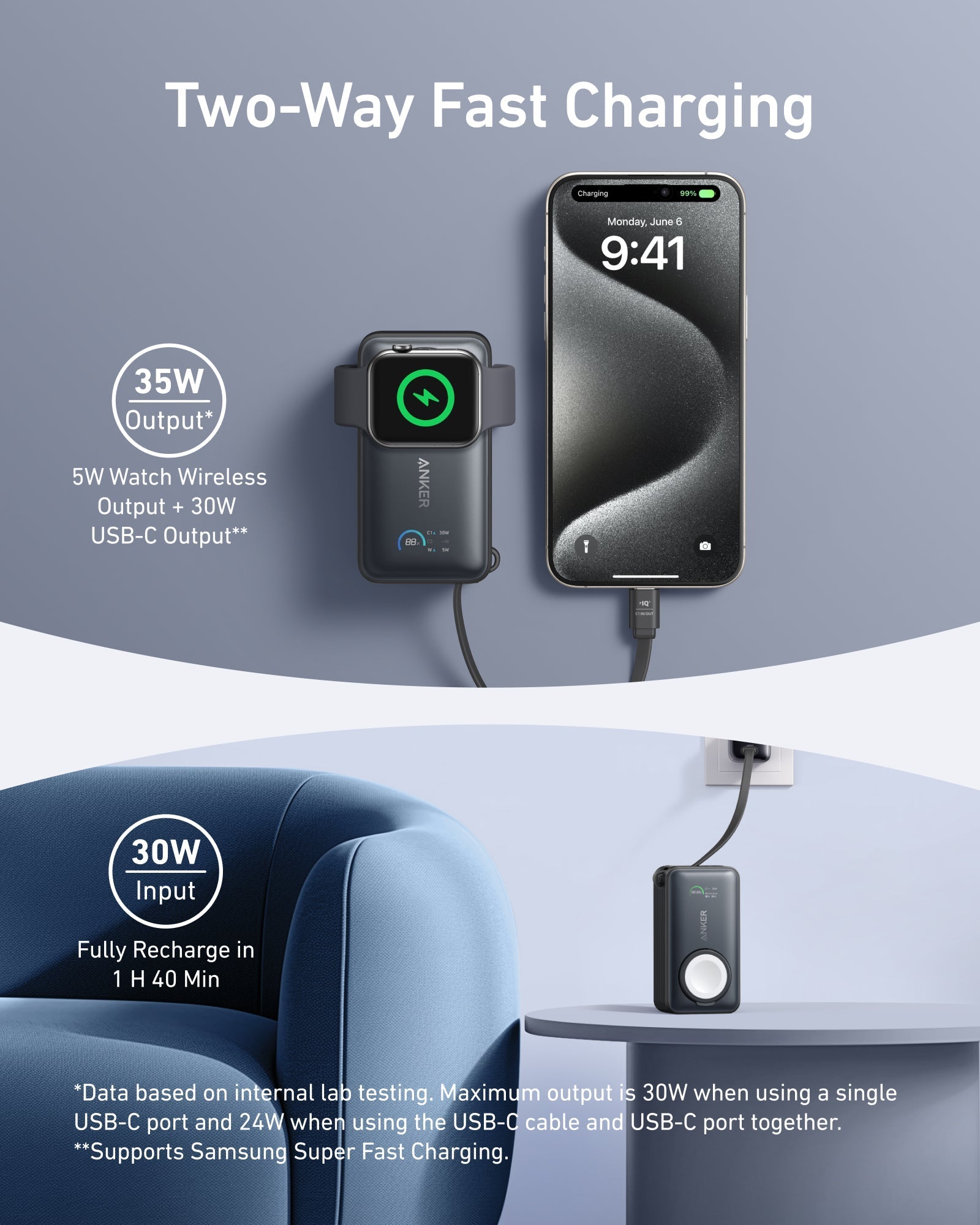 30W USB-C and 5W Apple Watch Charging: Supports simultaneous device charging with the built-in cable or port, offering up to 30W, alongside a wireless watch charger that provides up to 5W. The power bank fully recharges in 1.5 hours with a 30W maximum input.