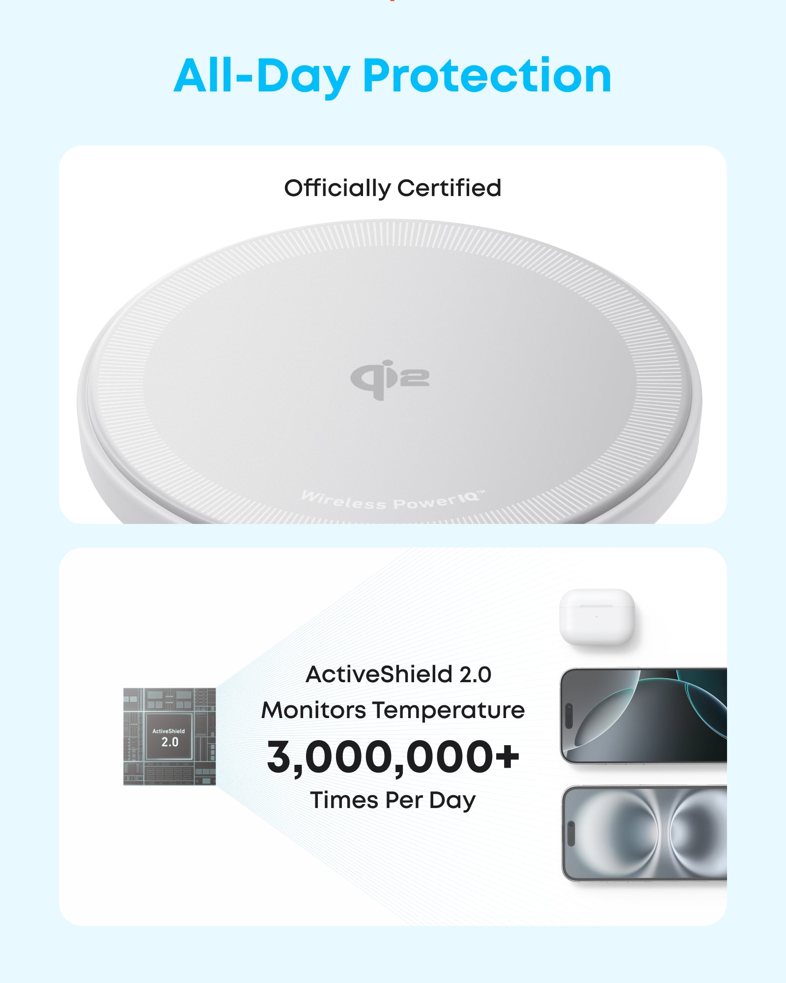 - Total Peace of Mind: This Qi2 certified charger features our ActiveShield 2.0 safety system, offering unmatched protection by monitoring temperatures over 8 million times daily. Through intelligent temperature control detection and safety protection, it effectively improves charging efficiency and safeguards the health of your phone's battery.