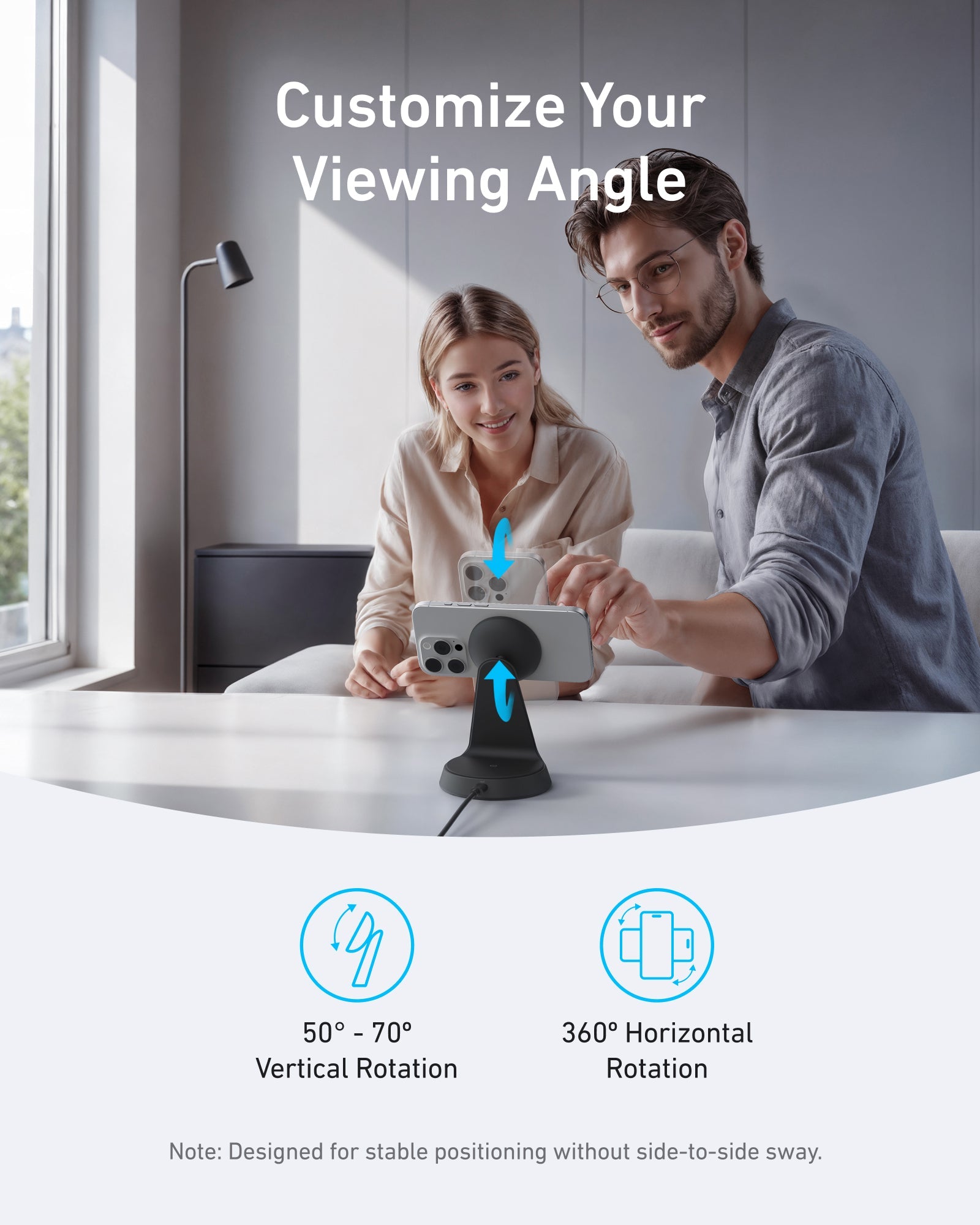 Adjust Your View: Easily adjust the viewing angle from 50° to 70° vertically and rotate 360° horizontally to find your perfect viewing position while charging.