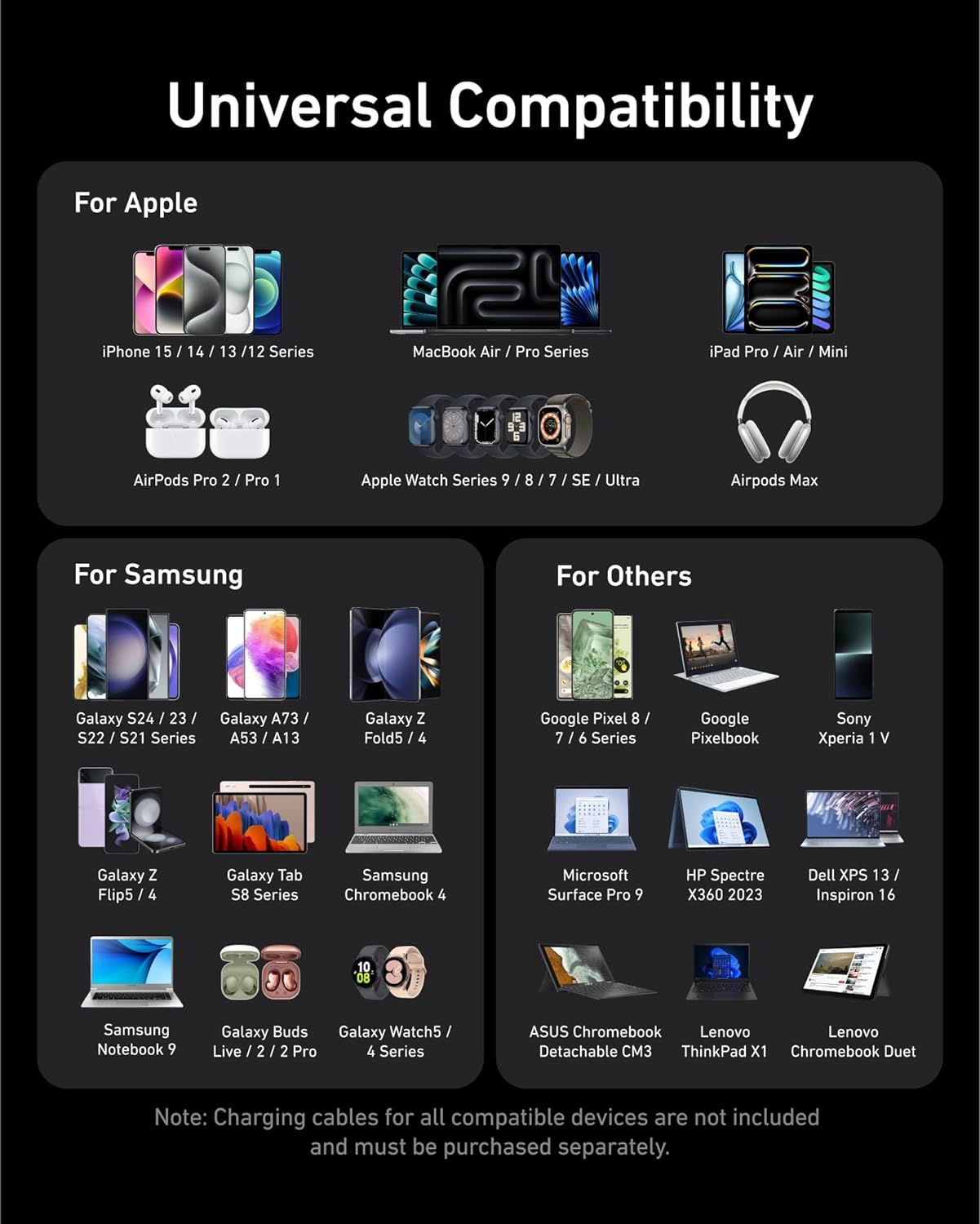- Built-in USB-C Cable: Directly charges phones and other smart devices without the need for any additional cables, offering a hassle-free experience suitable for both Android and Apple dual-device users. The C cable supports PD30W and is also compatible with Huawei's 22.5W fast charge.